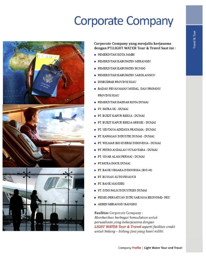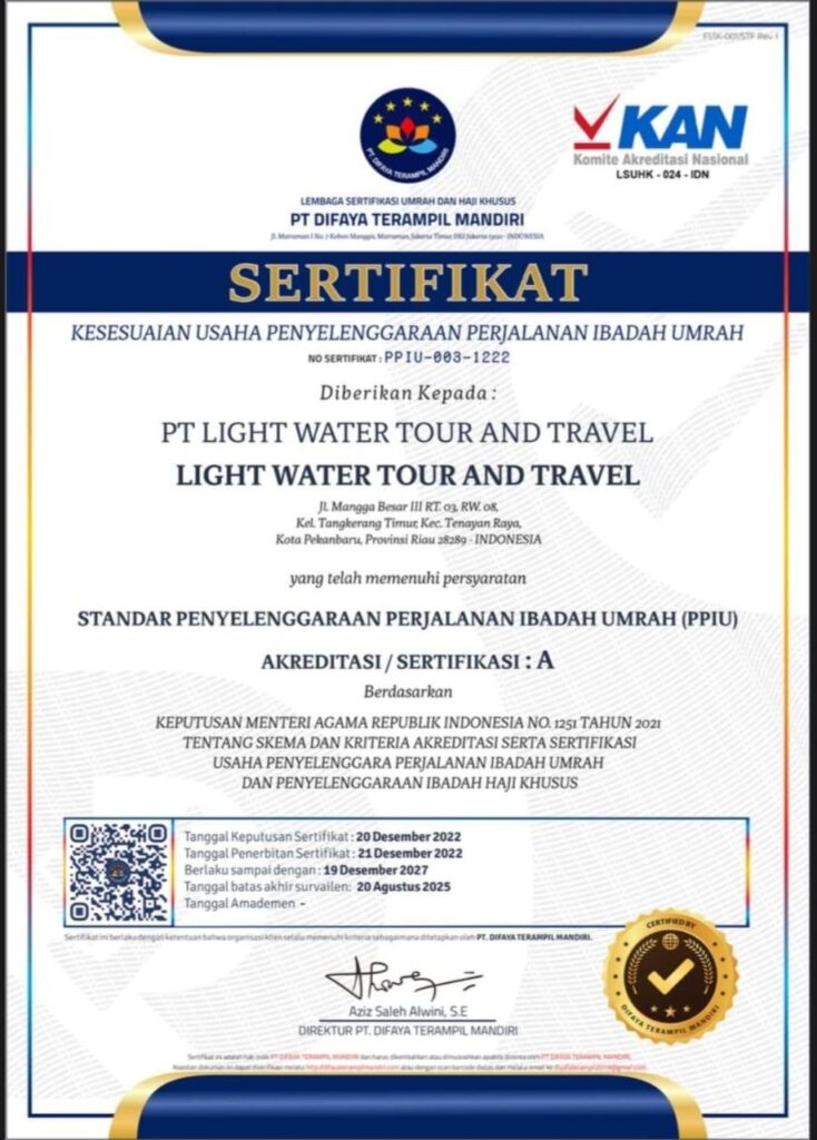 PT. LIGHT WATER atau dikenal dengan LIGHT WATER Tour & Travel adalah sebuah perusahaan yang bergerak di bidang jasa pelayanan Inbound Outbound Tours, Haji & Umroh, Domestic Internasional Ticketing, Meeting, Convention, Exhibitions, Voucher Hotels, Visa Pasport, dan Incentive yang berdiri pada tanggal 08 Februari 2008.
